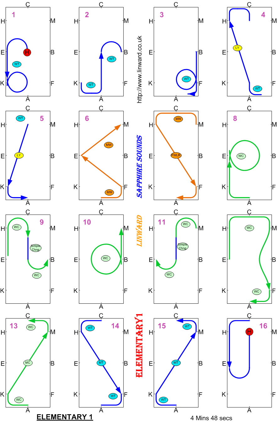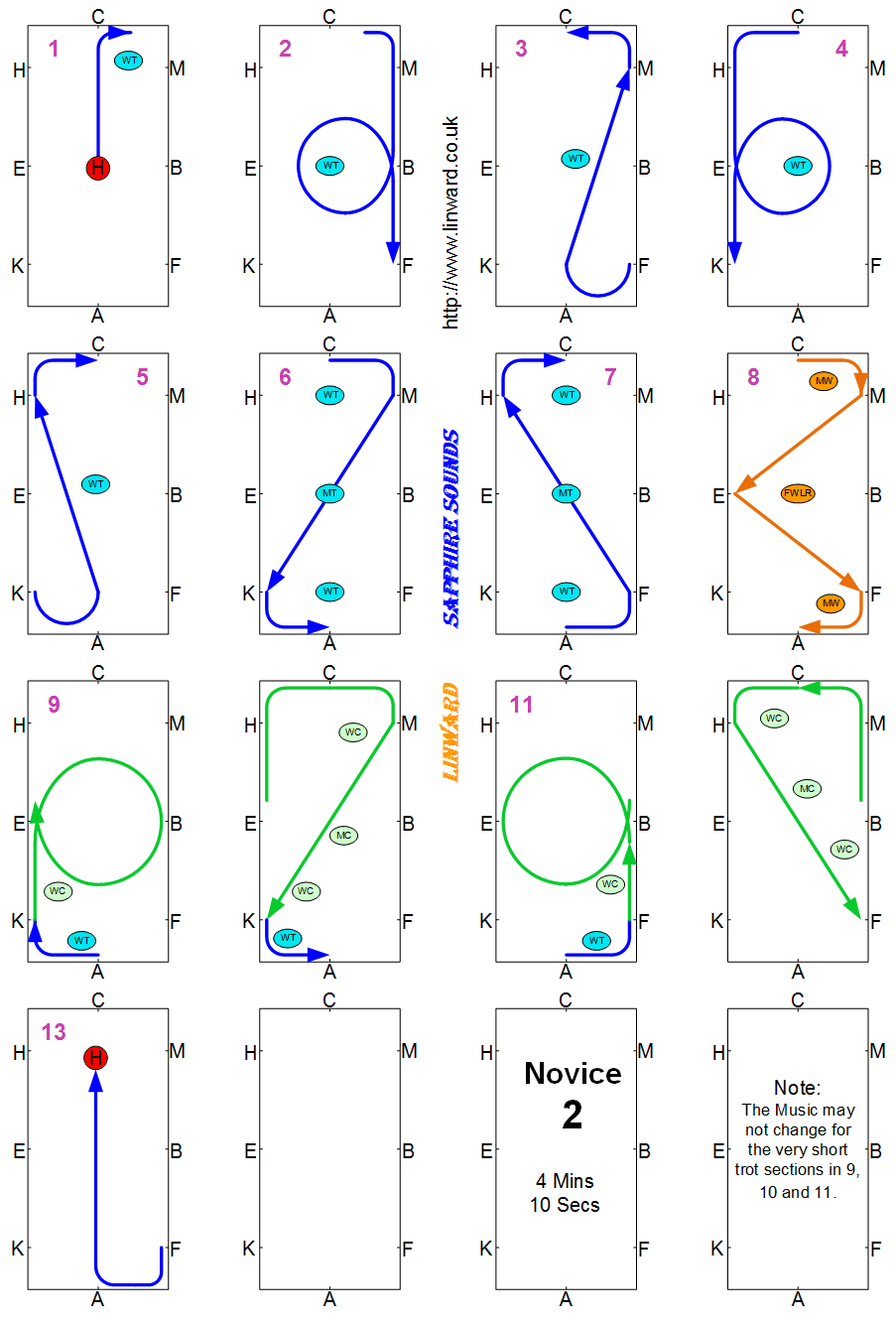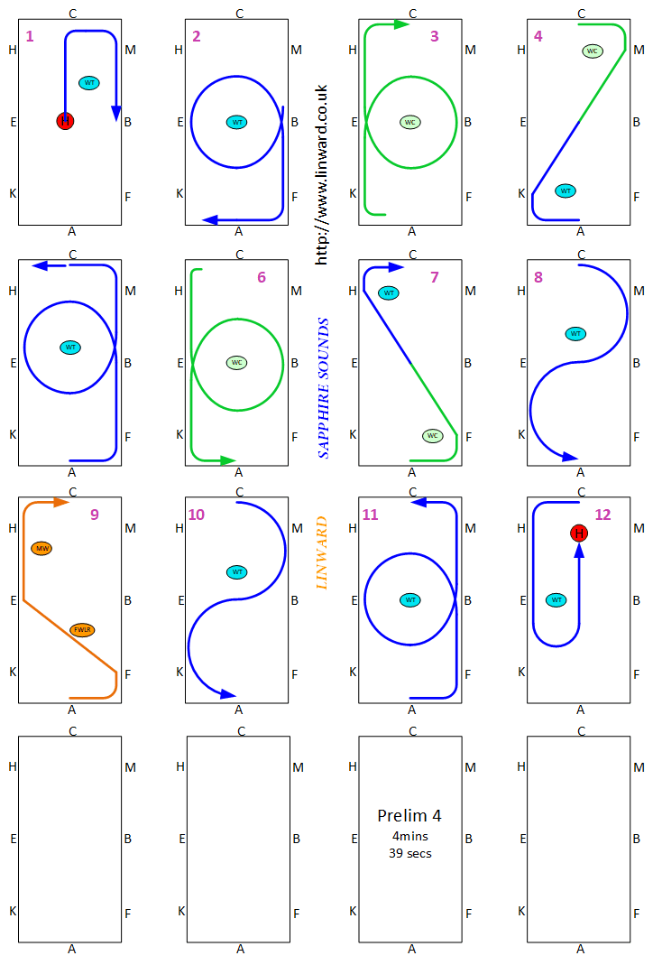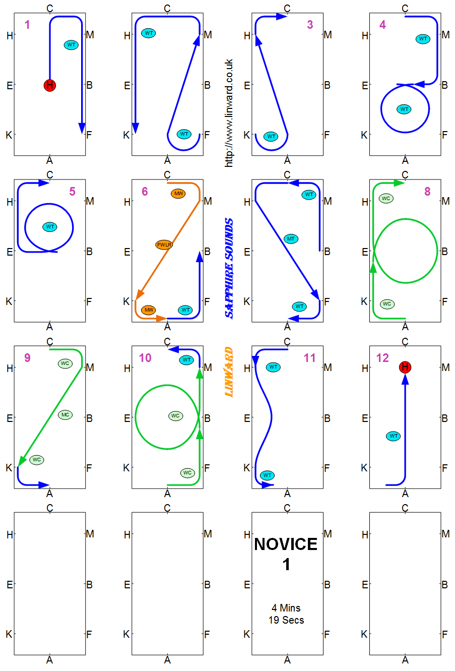 Novice test have to be between 4 and 5 Minutes. Novice tests should be in a 60m arena, but sometimes are not, check the competition schedule. BD now require you show some medium canter strides. These floorplans show the best place to show them but the tempo should not change so you can actually show them wherever in the canter you want.