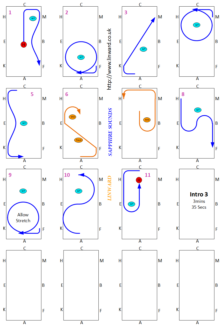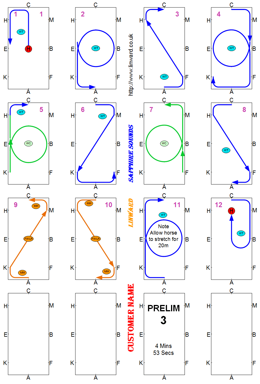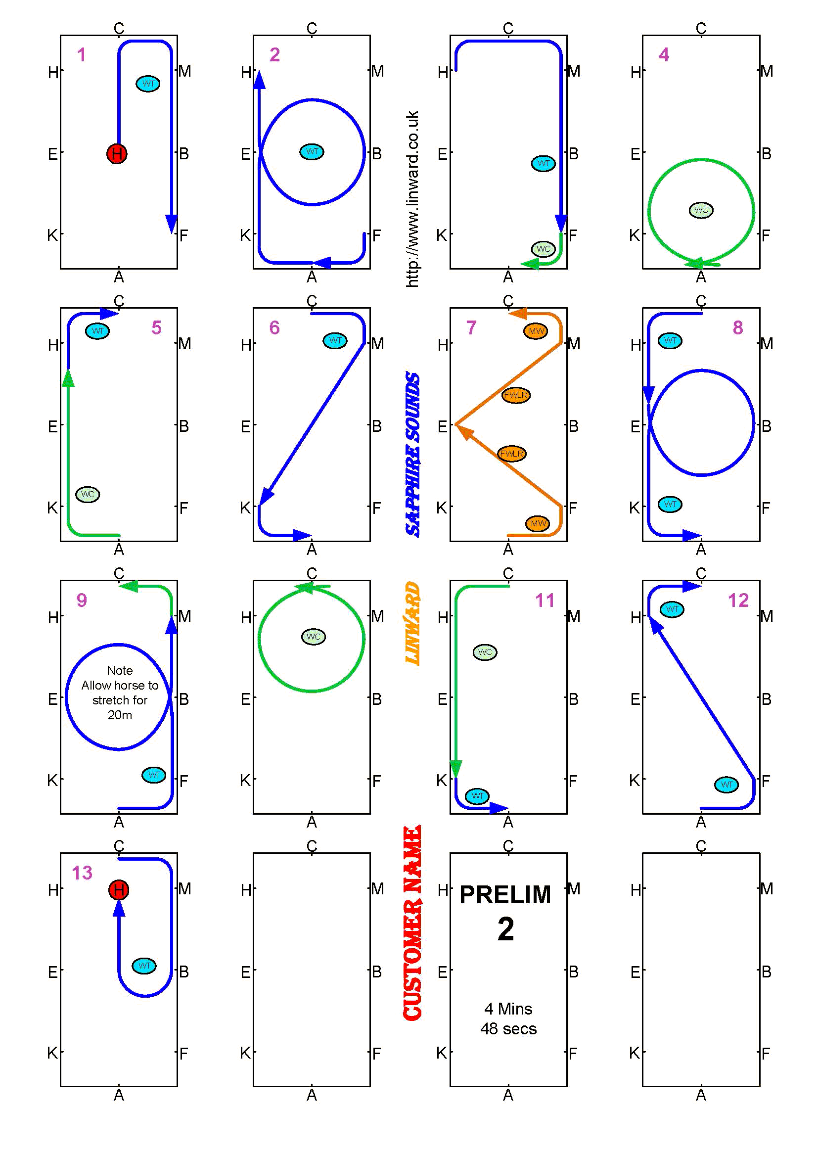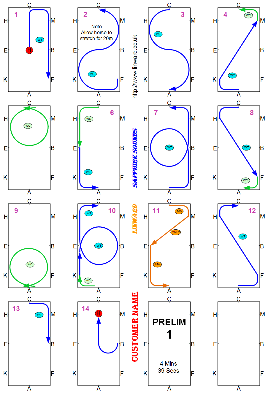 Novice test have to be between 4 and 5 Minutes. Novice tests should be in a 60m arena, but sometimes are not, check the competition schedule. BD now require you show some medium canter strides. These floorplans show the best place to show them but the tempo should not change so you can actually show them wherever in the canter you want.