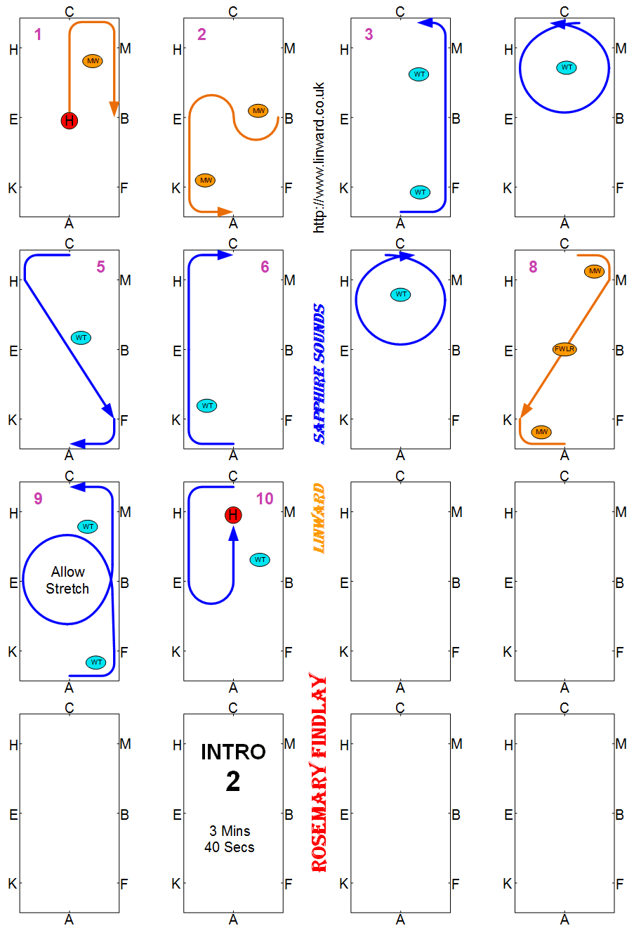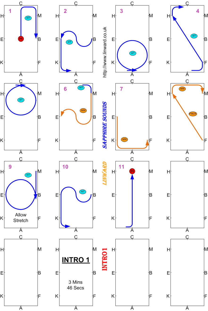 Introductory (walk and trot) tests are between 3.5 and 4 minutes long - there is no Canter music. Intro tests must be in a 40m arena.