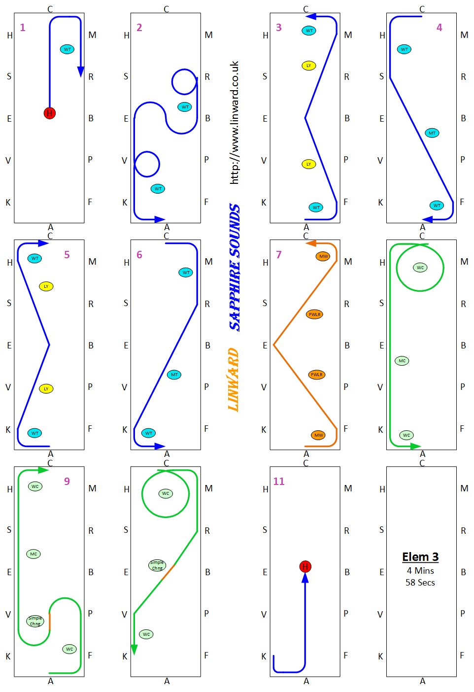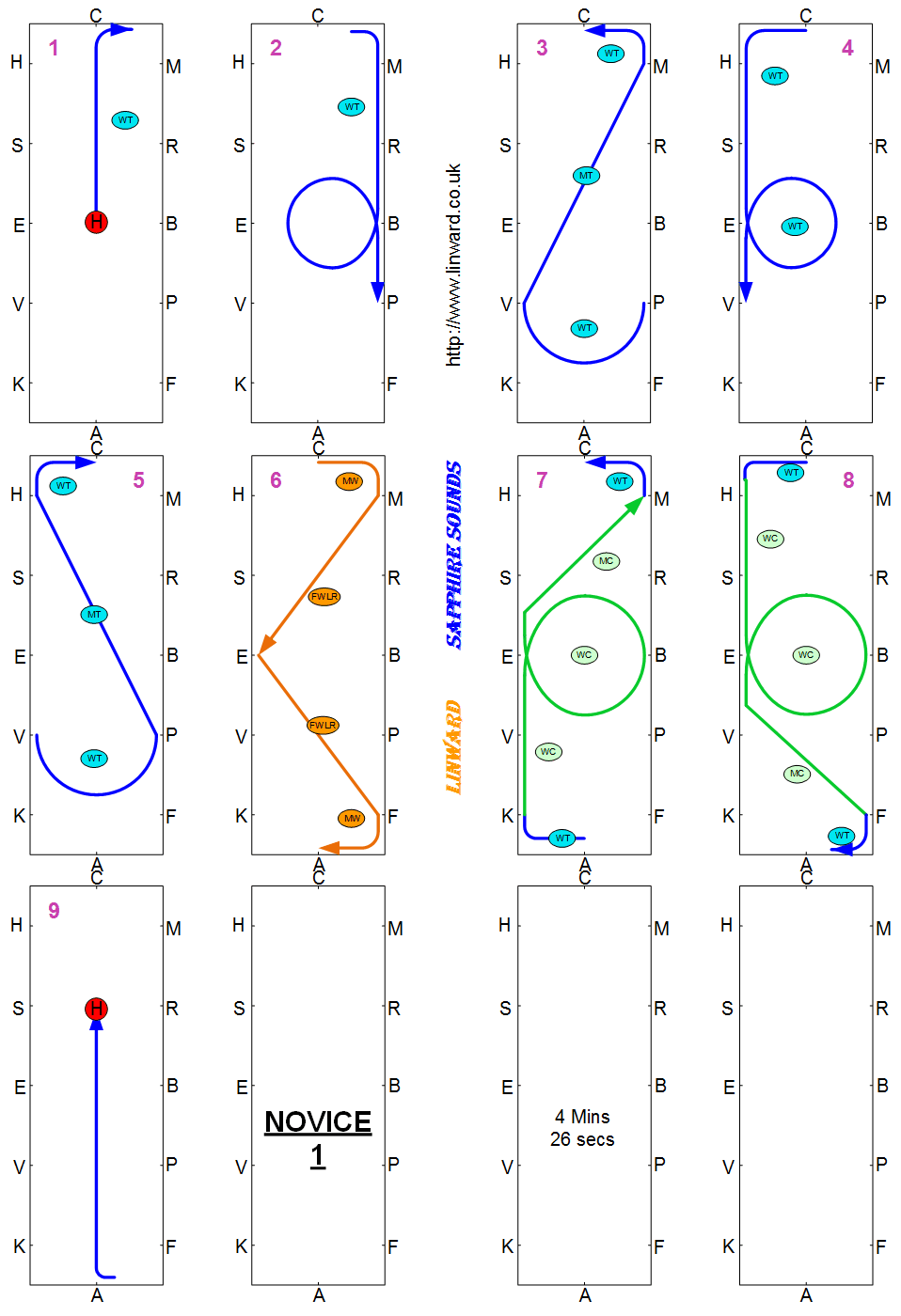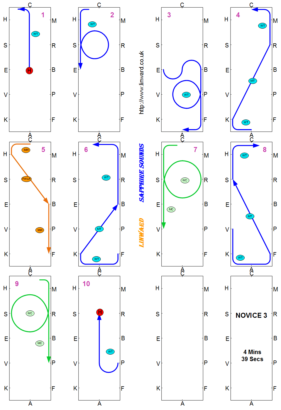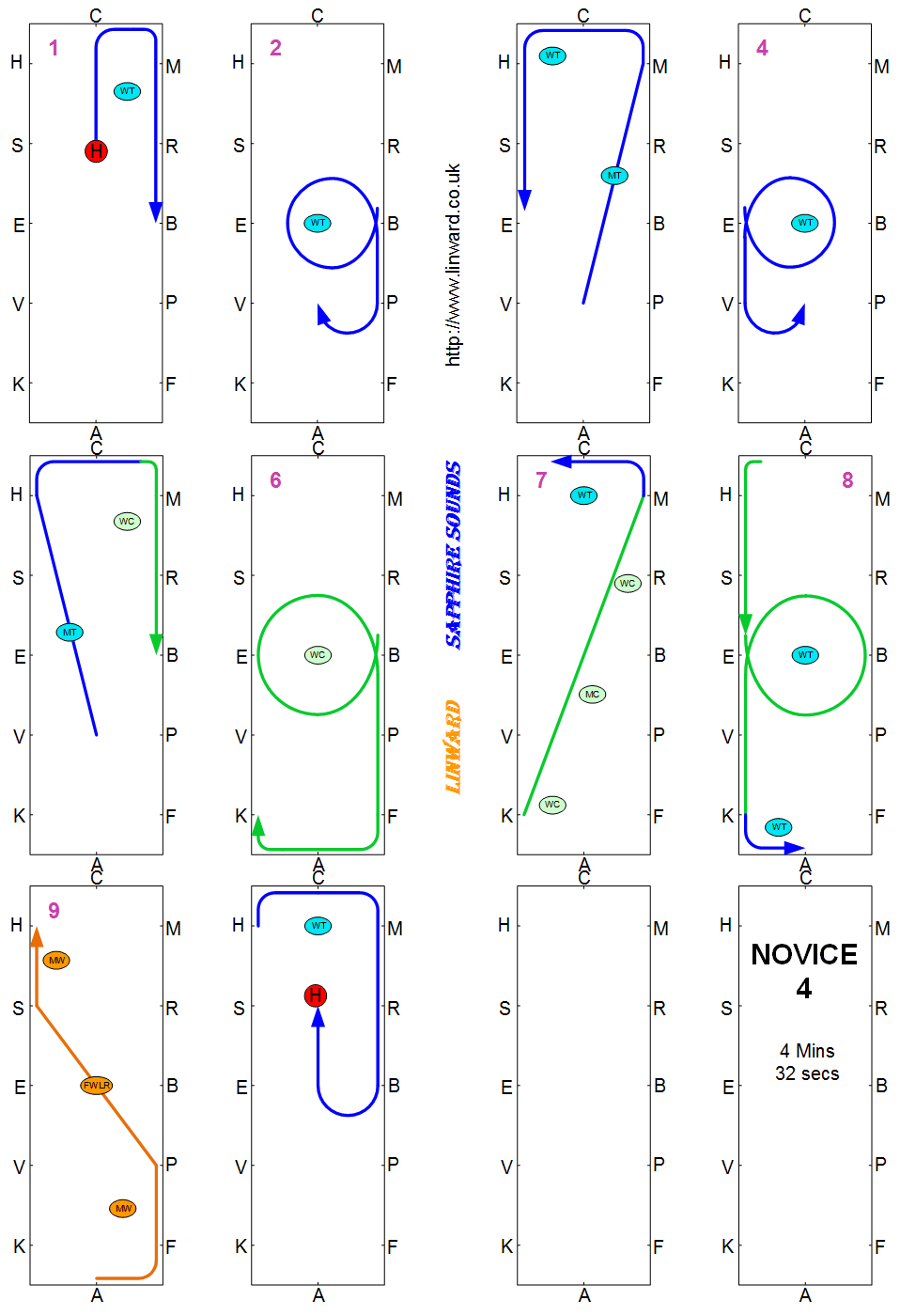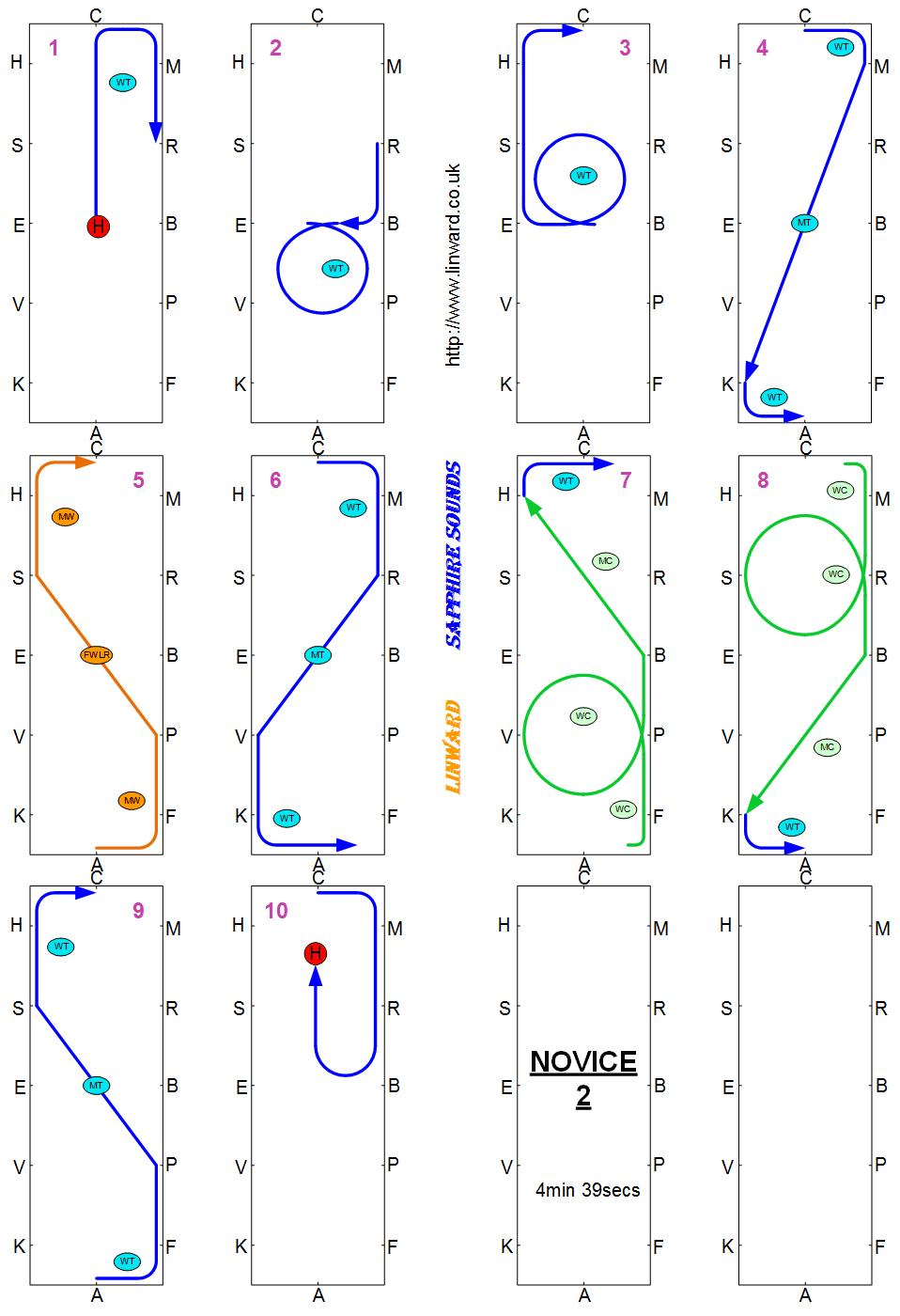 Novice test have to be between 4 and 5 Minutes. Novice tests may be in a 40m arena, but usually are not, check the competition schedule. BD now require you show some medium canter strides. These floorplans show the best place to show them but the tempo should not change so you can actually show them wherever in the canter you want