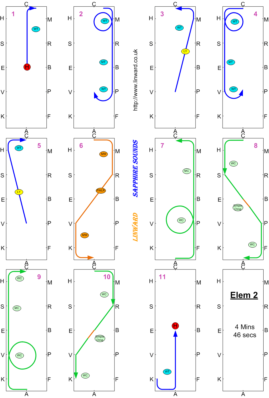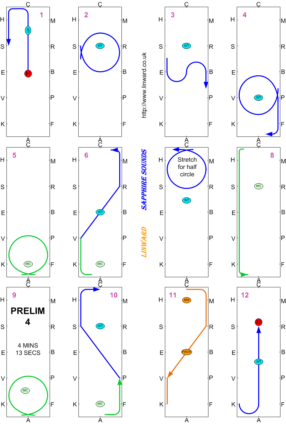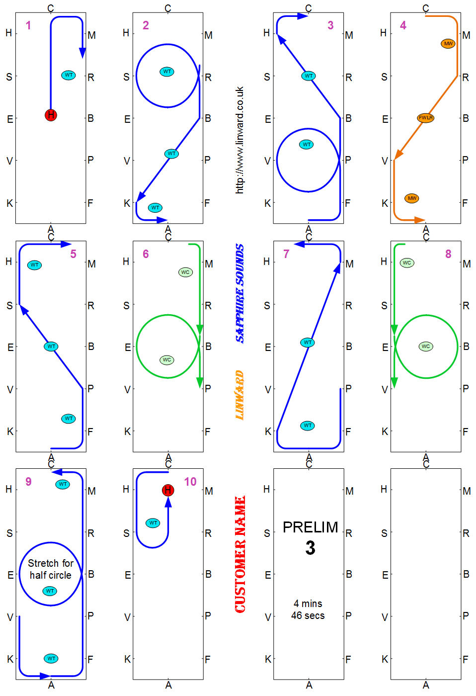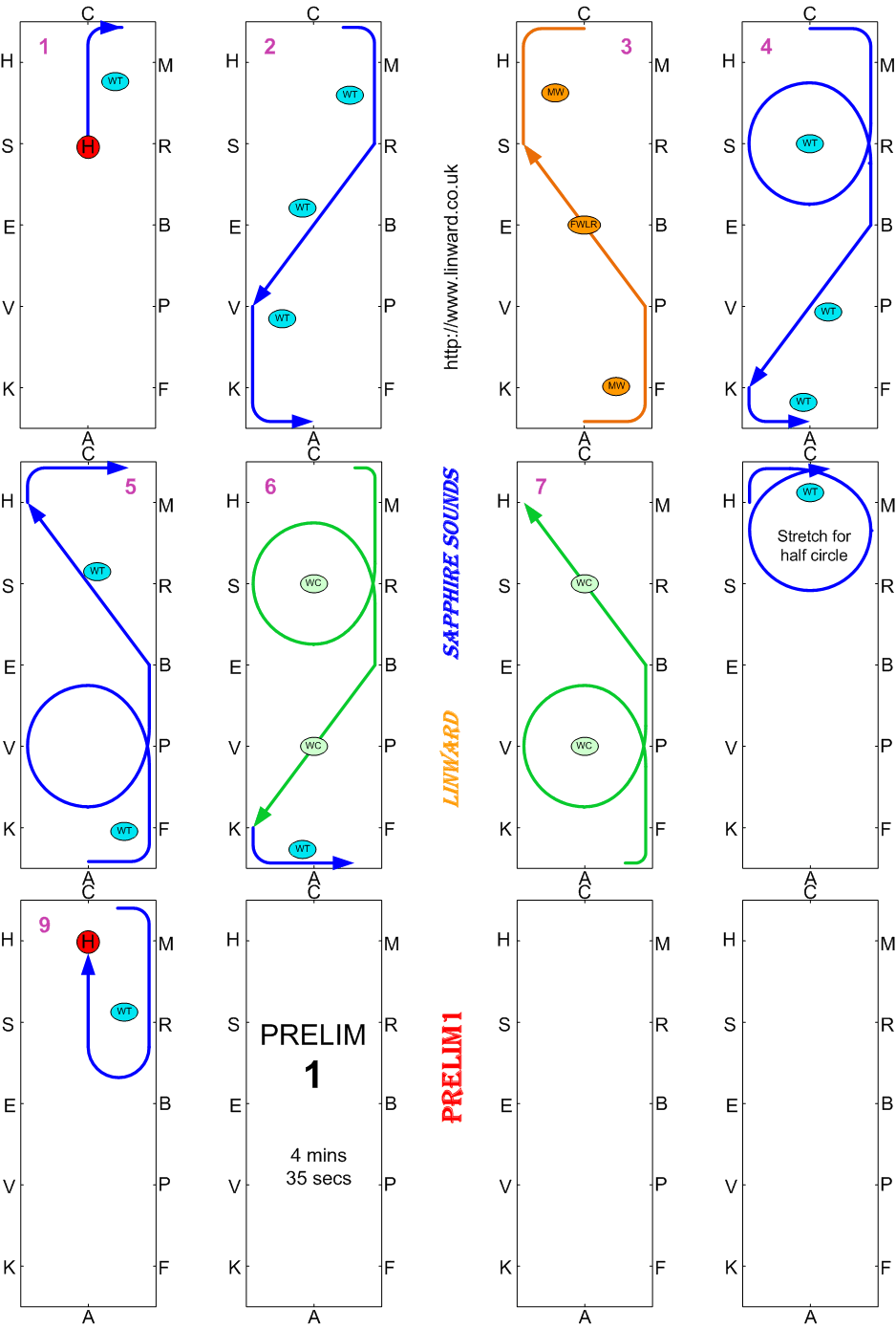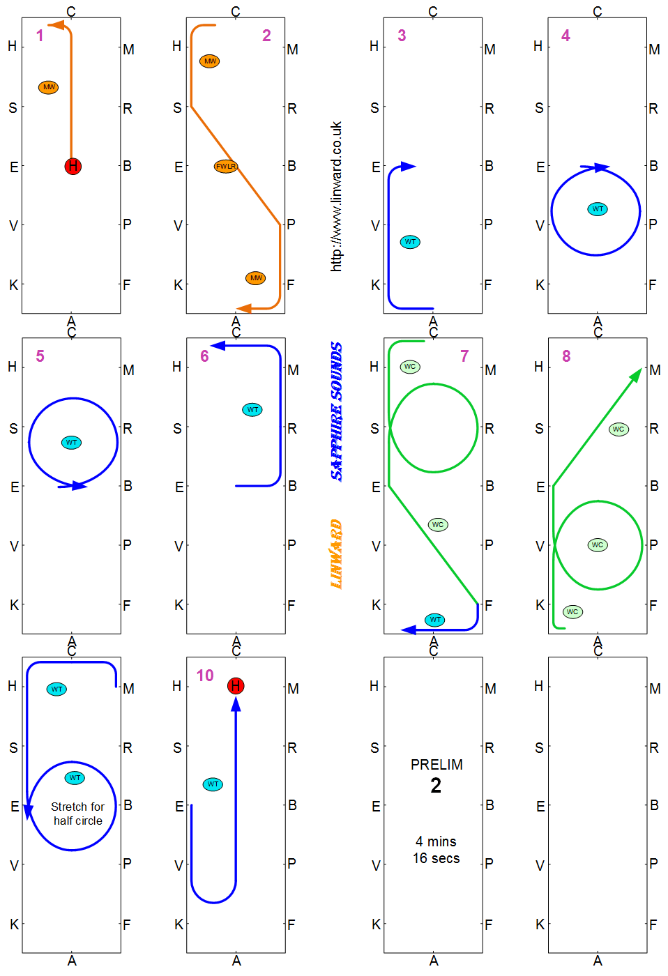 Novice test have to be between 4 and 5 Minutes. Novice tests may be in a 40m arena, but usually are not, check the competition schedule. BD now require you show some medium canter strides. These floorplans show the best place to show them but the tempo should not change so you can actually show them wherever in the canter you want